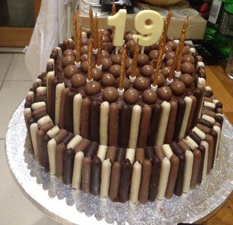 I made this birthday cake using the Rich Moist Chocolate Cake and Gooey Chocolate Topping recipes. Add 3 different colour Cadbury Finger Biscuits and some Maltesers and Hey Presto!